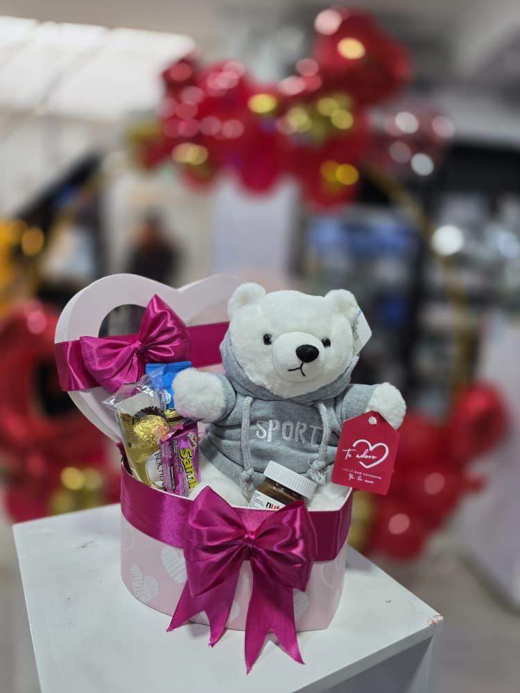 Nuestro arreglo 'Abrazo de chocolate' es la definición de amor moderno y detallista. Presentado en una delicada caja con forma de corazón y adornado con elegantes lazos de raso, este detalle destaca por su original osito con sudadera, listo para dar el abrazo más tierno. Equipado con la dosis perfecta de felicidad: Nutella, bombones Ferrero Rocher y chocolates variados, es el regalo ideal para sorprender a esa persona especial que ama los detalles con personalidad propia.
