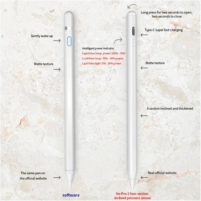 Lápiz óptico universal para tabletas. Compatible con Apple, Android y Windows. Incluye cable de carga.